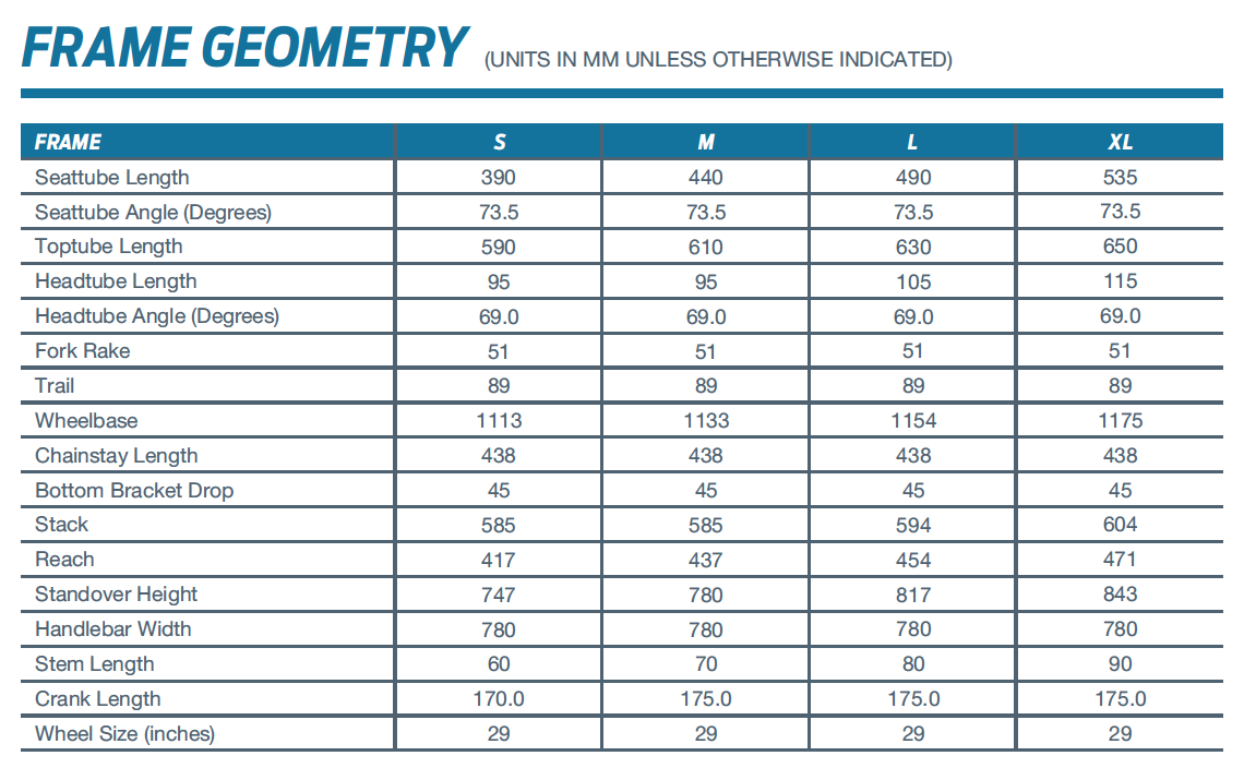 – 29 inch wheel specific geometry provides stable off-road handling.