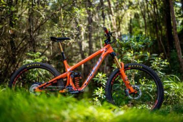 Another unique and highly effective aspect of the new Mach 5.5 is that the frame was designed with the new generation of ‘large volume’ tyres in mind. The back end of the bike is the business end which features a fast rolling Maxxis Rekon 2.6 tyre, whilst up front in the ‘party end’ you’ll find an aggressive 2.6” Minion DHF. The traction that these tyres deliver is awesome. It actually takes a little getting used to when you first hop on board the bike. Forget washing out on loose corners or having the back end slide out when riding off camber sections of trail with gravel of loose surface coverings. These Maxxis 2.6” tyres stick to the trail like pine tree sap sticks to your skin (for eternity)!
