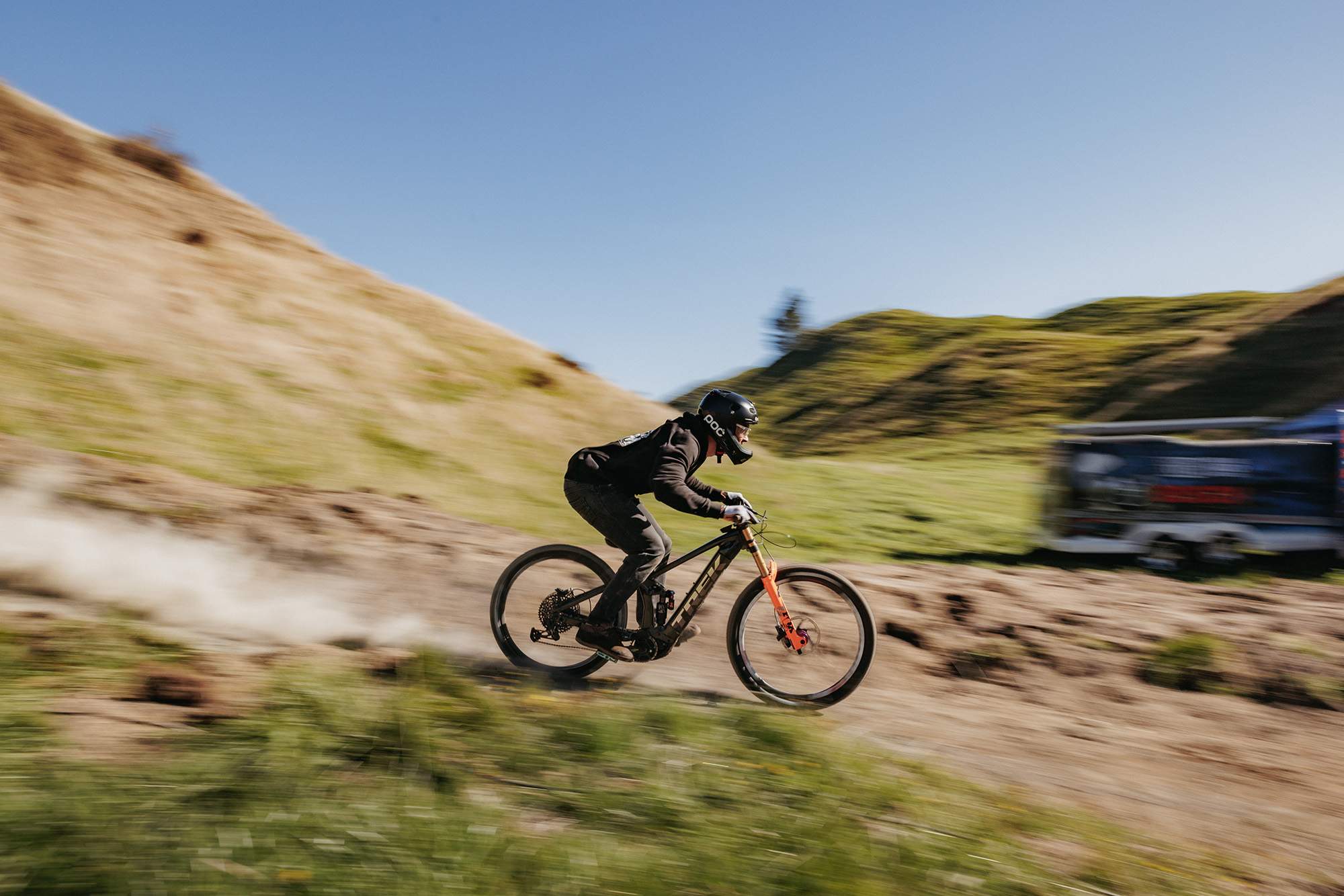 Super firm, obviously, but that doesn’t necessarily mean maxing out the air pressures and volume spacers. The front and rear suspension needed to be balanced to give a stable platform during the run in and on landing.