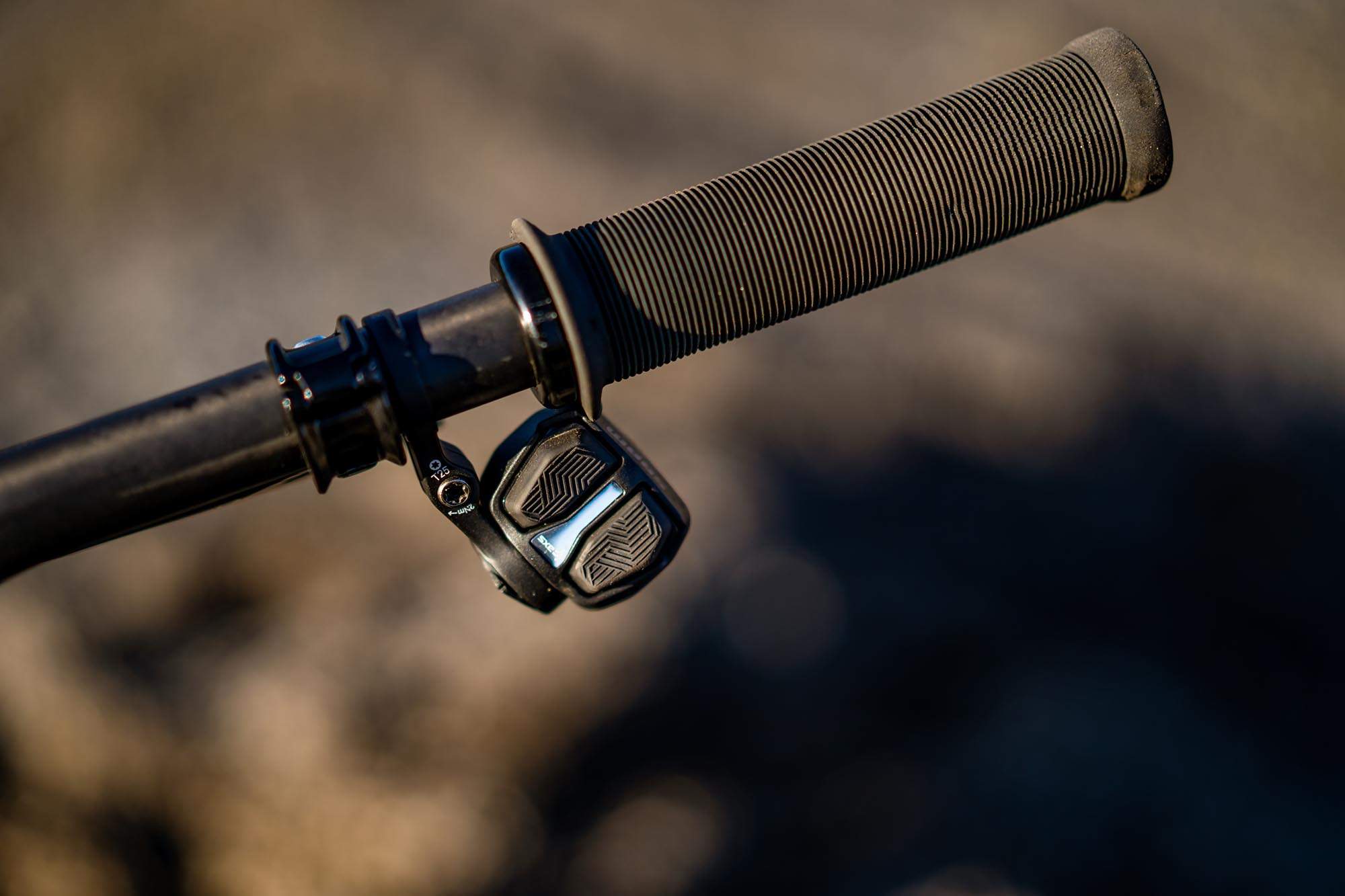 Aside from the outrageous appearance of the new rear mech, easily the next most striking part of the new Transmission are the gear shifters which SRAM are now calling ‘Pods’. They literally look nothing like any gear shifter we’ve ever seen, or touched, before. But, holy moly, they work and feel incredibly intuitive as soon as you get on the bike. Each pod features two vertical, in-line buttons. The unique design of the Pods also means that they’re ambidextrous, and simply get flipped in their mounts to toggle between left- and right-handed operation. And, as with the older-style controller, the button mapping is programmable in the AXS app (oh and there’s a new App which has just been launched to go with the new Transmission system) allowing for nearly unlimited customisation options in terms of setting up the 4 buttons between both left and right Pods to control/activate the bike’s shifting configuration, AXS dropper post and even adjusting the bike’s suspension if paired with a Flight Attendant system.